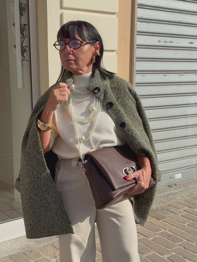 Cappottino effetto lana infeltrita, vestibilità ad ovetto, collo alla coreana, chiusura con bottoni. Veste fino a una taglia 48.