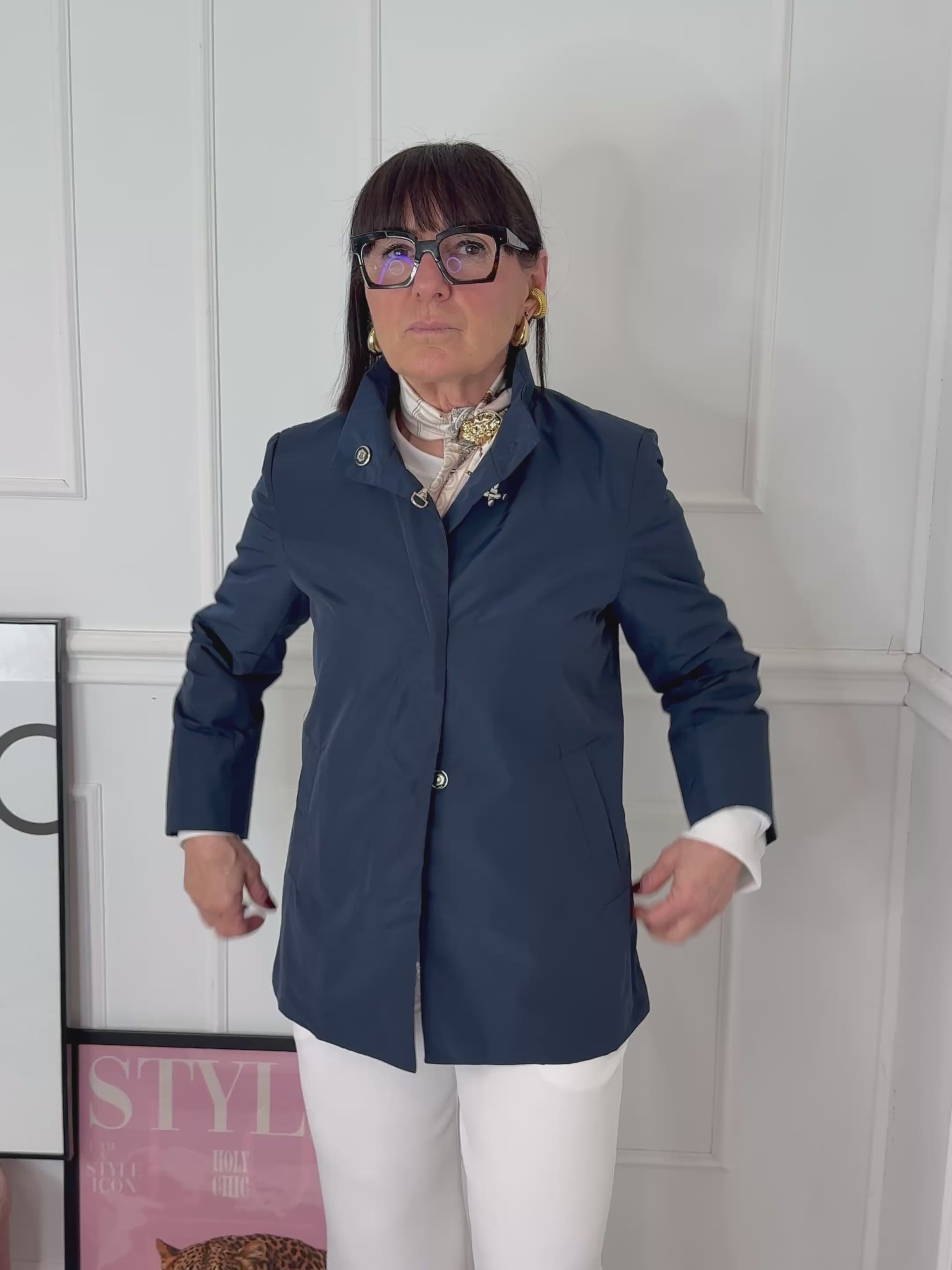 Giubbino in tessuto tecnico, chiusura con comodi bottoni e morsetto nella parte superiore, tasche, vestibilità morbida sul fianco.