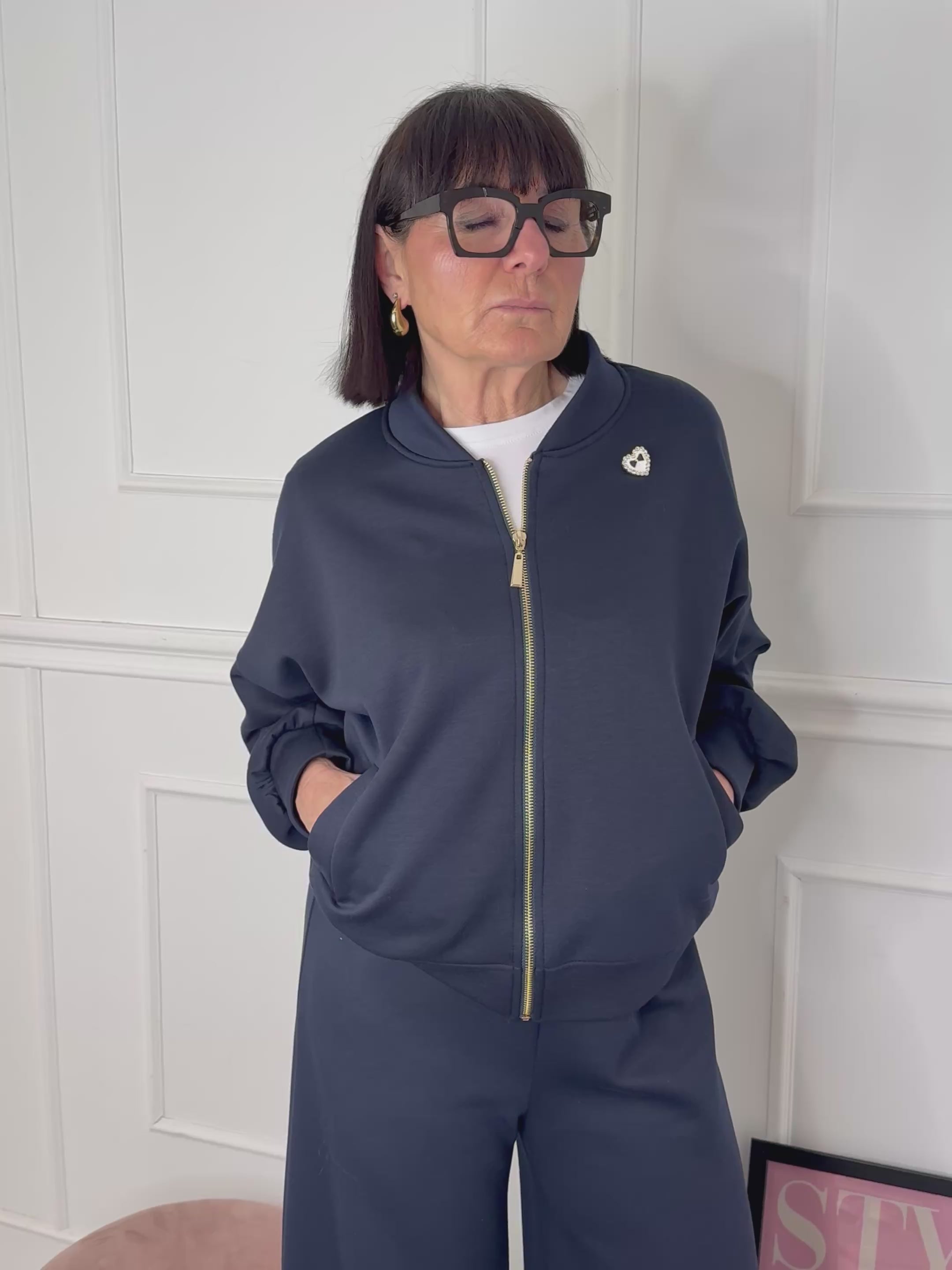 Completo tuta composto da: felpa bomber con chiusura con zip, vestibilità morbida, collo coreana, pantalone a palazzo con comodo elastico in vita. Taglia unica veste fino a una 46.
