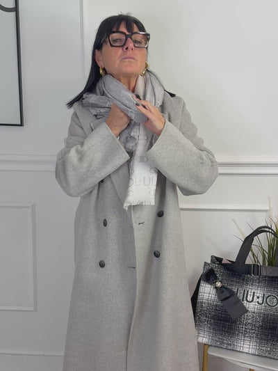 Cappotto in misto lana doppiopetto lungo, scollo con revers, chiusura con bottoni e vestibilità over.